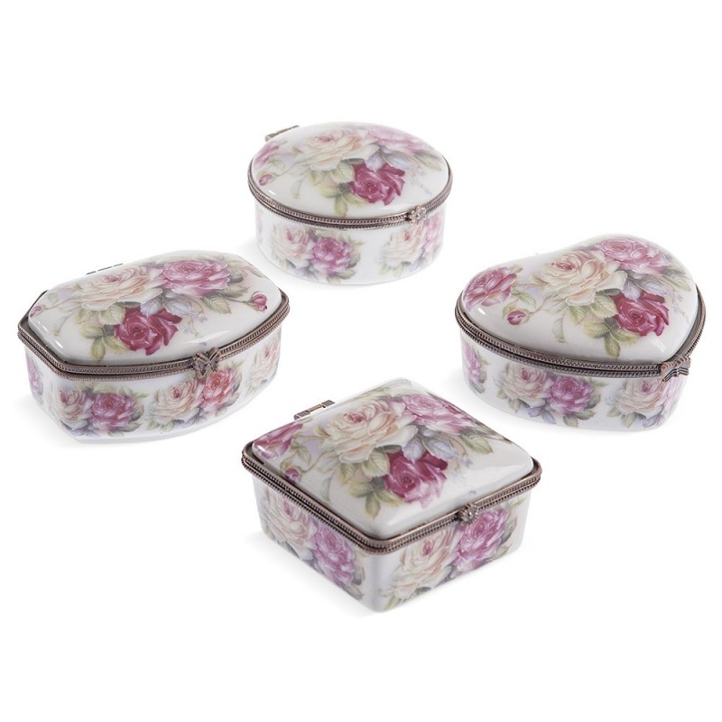 Vintage μπιζουτιέρα από πορσελάνη διακοσμημένη με λουλούδια και με κούμπωμα σε μπρονζέ χρώμα. Η συσκευασία περιλαμβάνει 4 διαφορετικά σχήματα μπιζουτιέρας, στρογγυλό, καρδιά, τετράγωνη και οβάλ.