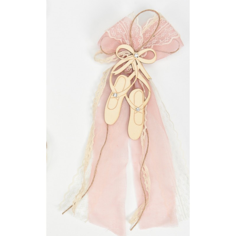 Μπομπονιέρα ξύλινη παπουτσάκια με ροζ κορδέλα και τούλι