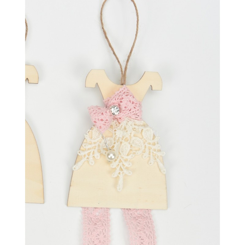 Μπομπονιέρα ξύλινο φόρεμα με κορδέλα και δαντέλα