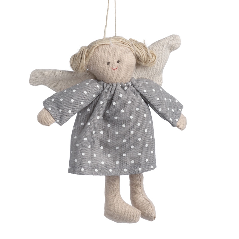 Υφασμάτινο κρεμαστό αγγελάκι κοριτσάκι.Ντυμένο με γκρι πουά φορεματάκι.