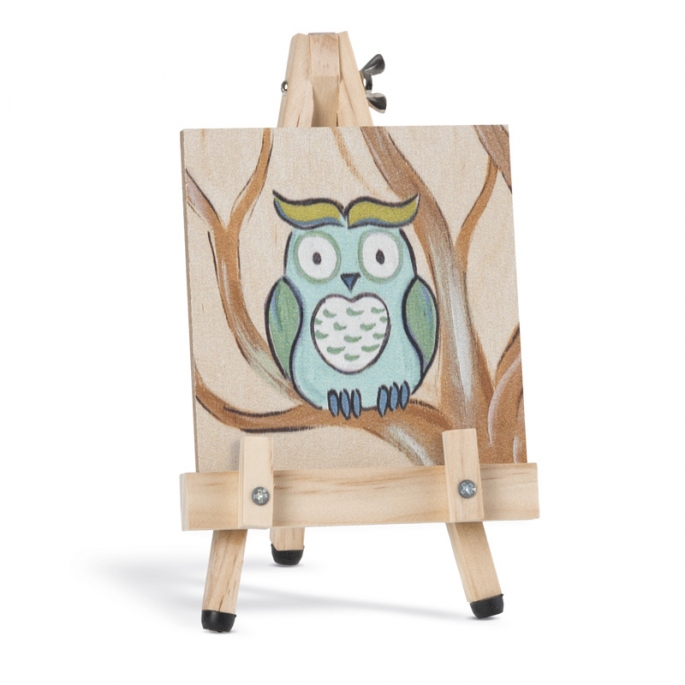 Ξύλινο καδράκι print σε καβαλέτο.Η παράσταση είναι κουκουβάγια σε βεραμάν χρωματισμούς.