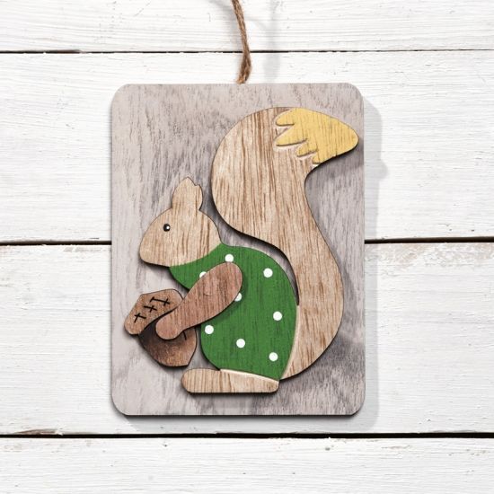 Ξύλινο κρεμαστό διακοσμητικό καδράκι σε natural απόχρωση. Διακοσμημένο με σκιουράκι , που κρατάει το βελανιδάκι του, σε πράσινο πουά χρώμα.