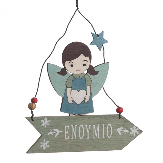 Ξύλινο κρεμαστό τόξο που αναγράφει τη λέξη “ΕΝΘΥΜΙΟ”. Πάνω στο τόξο υπάρχει ένα αγγελάκι σε πράσινο χρώμα. Το σύρμα με το οποίο κρεμιέται είναι διακοσμημένο με χαντρούλες και αστέρι.