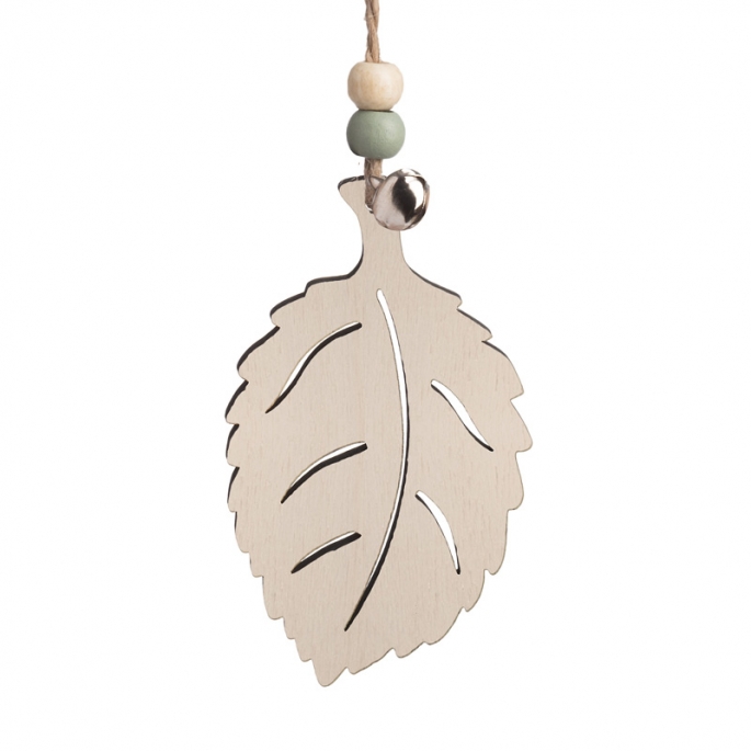 Ξύλινο κρεμαστό φύλλο σε natural απόχρωση. Στο πάνω μέρος είναι διακοσμημένο με βεραμάν χάντρες,κουδουνάκι και σπάγγο.