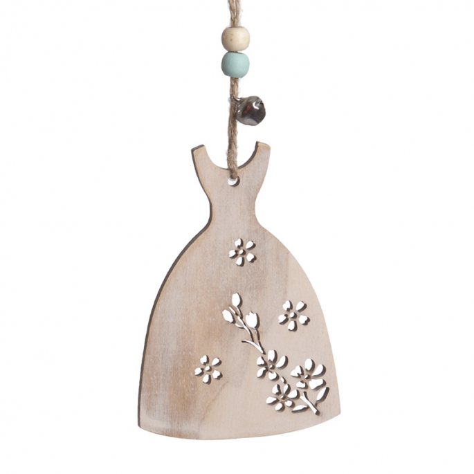 Ξύλινο κρεμαστό φορεματάκι με λουλουδάκια διακοσμημένο με βεραμάν και εκρού χάντρες και μεταλλικό κουδουνάκι. Ιδανικό για διακόσμηση.