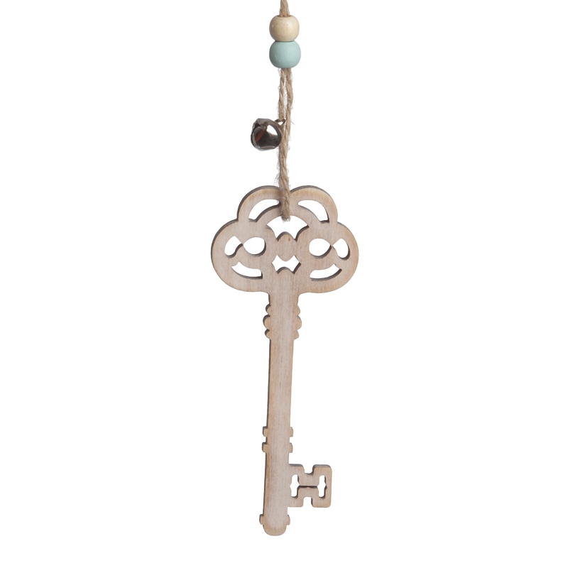 Ξύλινο κρεμαστό κλειδί διακοσμημένο με βεραμάν και εκρού χάντρες και μεταλλικό κουδουνάκι. Ιδανικό για διακόσμηση.