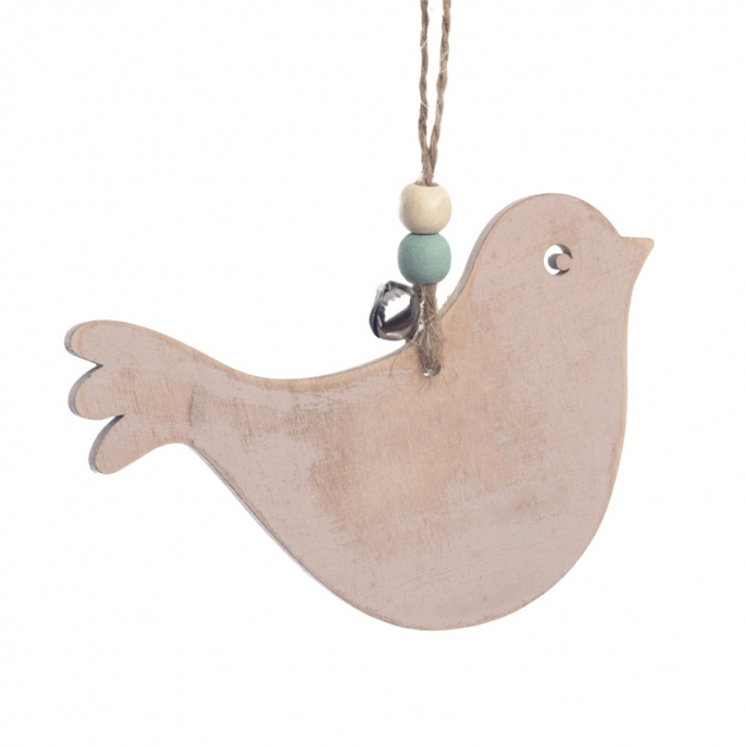 Ξύλινο κρεμαστό πουλάκι διακοσμημένο με βεραμάν και εκρού χάντρες και μεταλλικό κουδουνάκι. Ιδανικό για διακόσμηση.