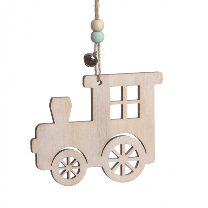 Ξύλινο κρεμαστό τρενάκι διακοσμημένο με βεραμάν και εκρού χάντρες και μεταλλικό κουδουνάκι. Ιδανικό για διακόσμηση.