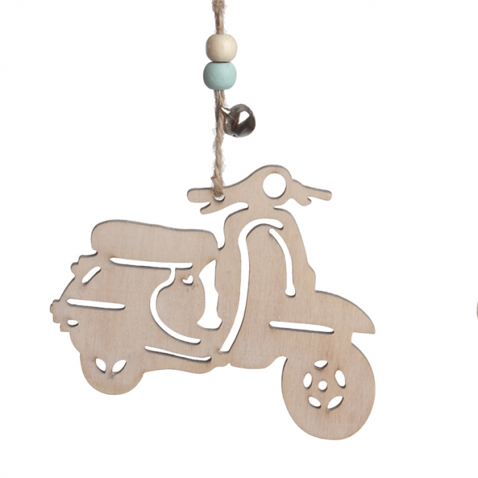Ξύλινη κρεμαστή βέσπα διακοσμημένη με βεραμάν και εκρού χάντρες και μεταλλικό κουδουνάκι. Ιδανικό για διακόσμηση.