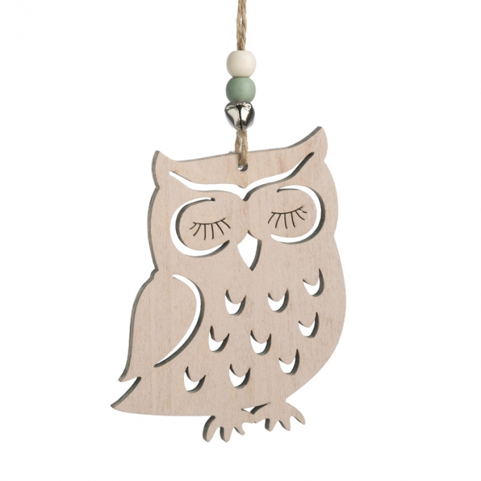 Ξύλινη κρεμαστή κουκουβάγια σε natural απόχρωση. Στο πάνω μέρος είναι διακοσμημένο με βεραμάν χάντρες,κουδουνάκι και σπάγγο.
