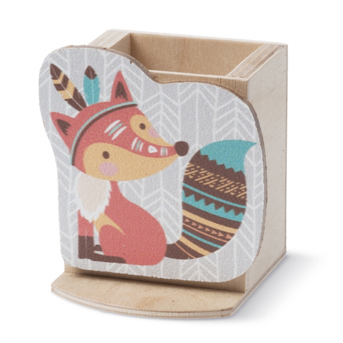 Ξύλινη μολυβοθήκη σε natural χρώμα. Διακοσμημένο με κοπτικό.Η παράσταση είναι αλεπουδάκι σε ethnic αποχρώσεις.