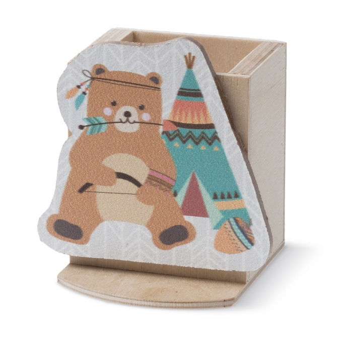Ξύλινη μολυβοθήκη σε natural χρώμα. Διακοσμημένο με κοπτικό.Η παράσταση είναι αρκουδάκι σε ethnic αποχρώσεις.