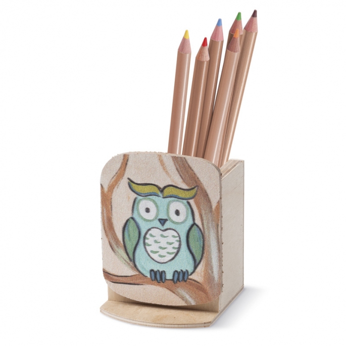 Ξύλινη μολυβοθήκη σε natural χρώμα. Διακοσμημένο με κοπτικό.Η παράσταση είναι κουκουβάγια σε ethnic αποχρώσεις.