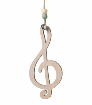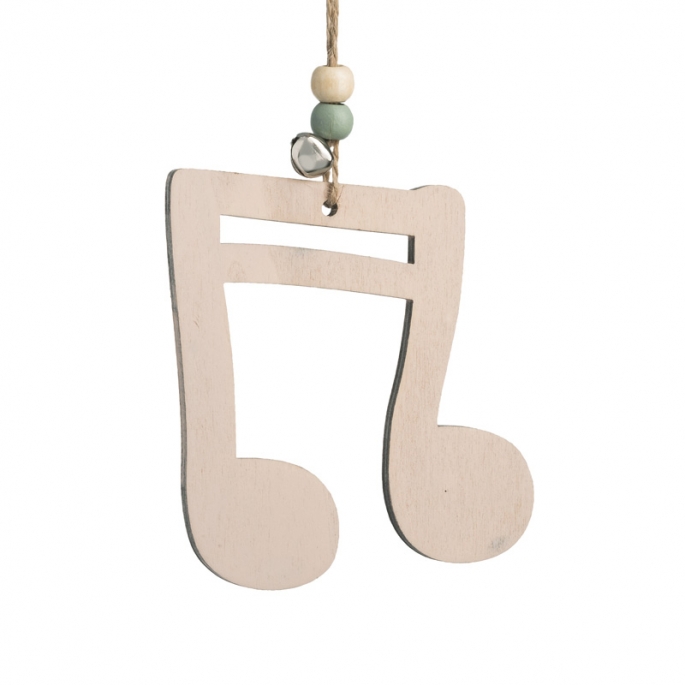 Ξύλινη κρεμαστή νότα σε natural απόχρωση. Στο πάνω μέρος είναι διακοσμημένο με βεραμάν χάντρες,κουδουνάκι και σπάγγο.