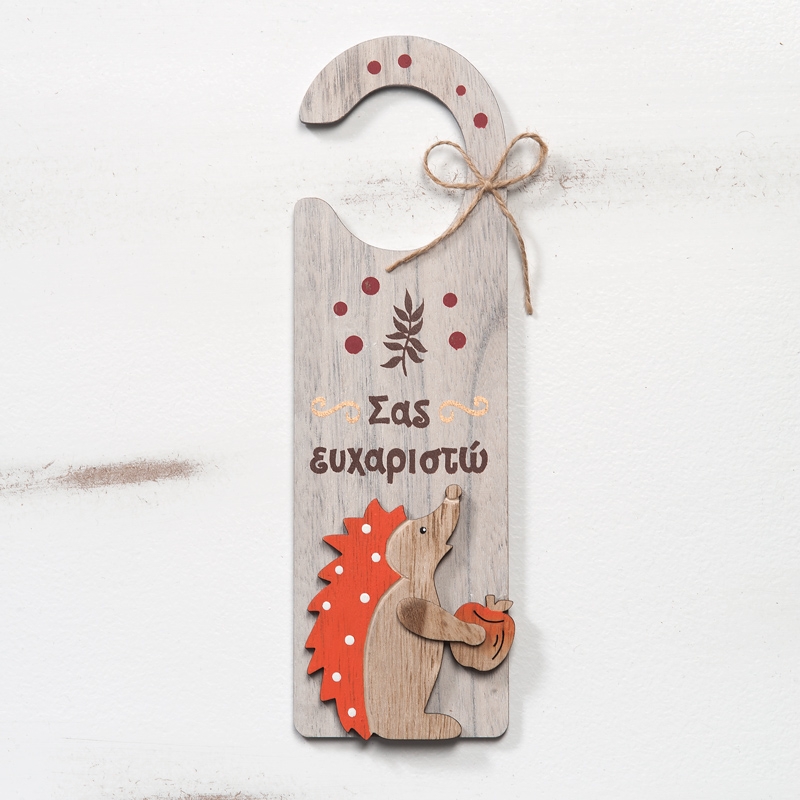 Ξύλινο διακοσμητικό πόρτας σε natural απόχρωση. Διακοσμημένο με πορτοκαλί πουά σκαντζόχοιρο.Αναγράφεται η φράση “Σας ευχαριστώ”.