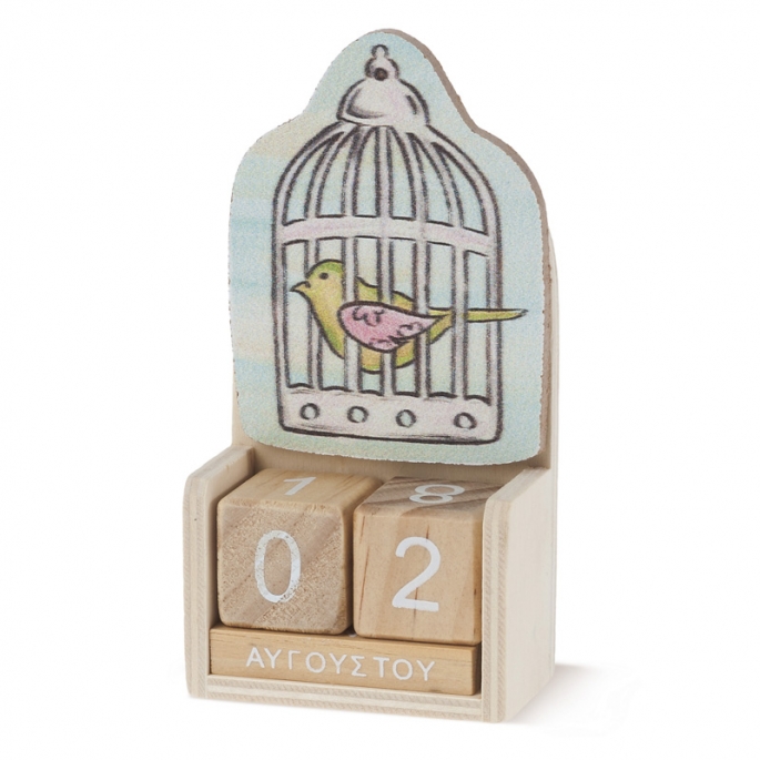 Ξύλινο ημερολόγιο με κύβους σε natural χρώμα. Διακοσμημένο με κοπτικό.Η παράσταση είναι κλουβί σε βεραμάν απόχρωση.
