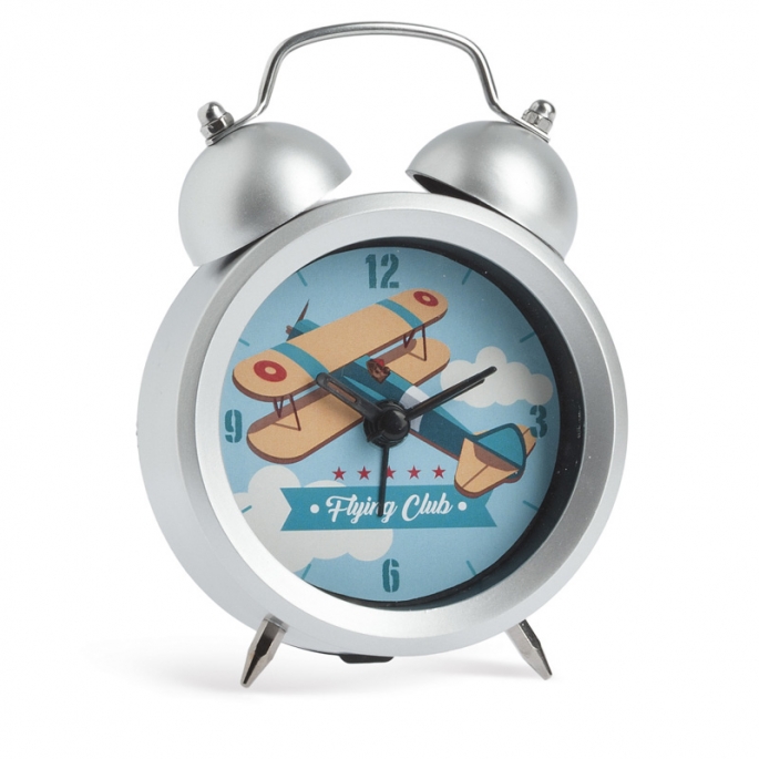 PVC επιτραπέζιο ρολόι-ξυπνητήρι με παράσταση κίτρινο αεροπλάνο σε σιέλ φόντο. Με μηχανισμό μπαταρίας(Quartz). Το εξωτερικό κομμάτι είναι σε ασημί χρώμα. Στο εσωτερικό κομμάτι η παράσταση είναι τυπωμένη.