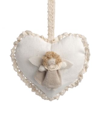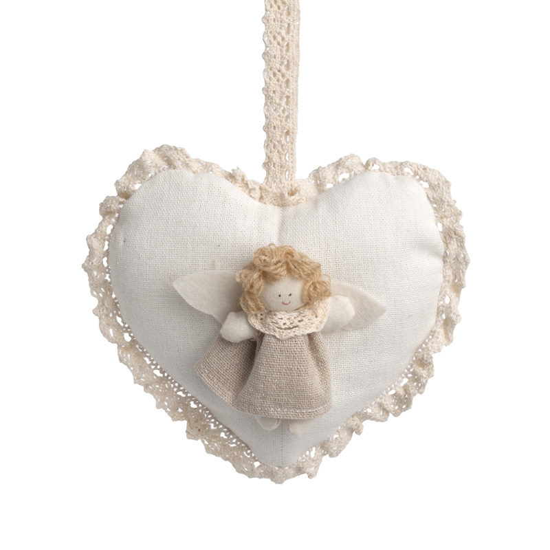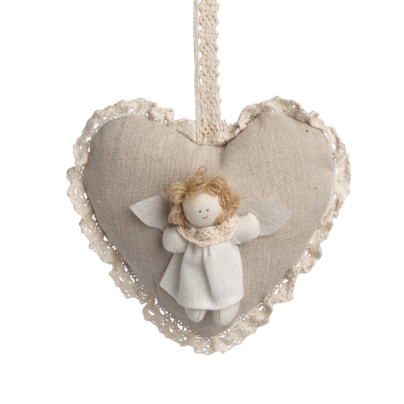Υφασμάτινη κρεμαστή διακοσμητική καρδιά. Διακοσμημένη στο κέντρο με αγγελάκι. Ο κωδικός περιλαμβάνει 2 συνδυασμούς χρωμάτων, καφέ & λευκό.