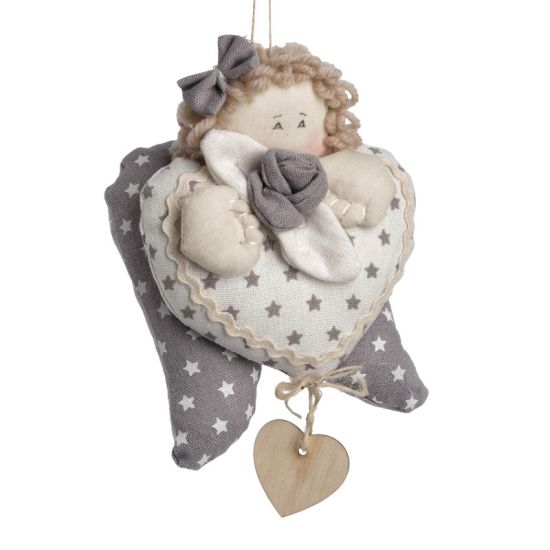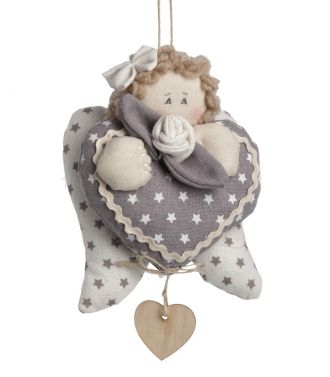 Υφασμάτινο κρεμαστό διακοσμητικό αγγελάκι-κοριτσάκι.Στη μέση είναι διακοσμημένο με καρδιά. Ο κωδικός περιλαμβάνει 2 συνδυασμούς χρωμάτων, γκρι & λευκό πουά.