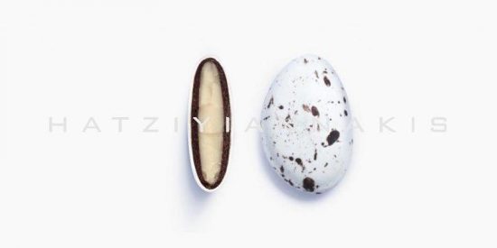 Λευκή σοκολάτα & σοκολάτα (55% κακάο) με λεπτή επικάλυψη ζάχαρης, σε γεύση στρατσιατέλα.