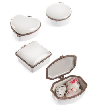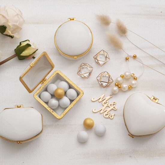 Μπιζουτιέρα λευκή από πορσελάνη με κούμπωμα σε χρυσό χρώμα. Η συσκευασία περιλαμβάνει 4 διαφορετικά σχήματα μπιζουτιέρας, στρογγυλό, καρδιά, τετράγωνη και ορθογώνια.