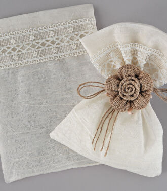 Πουγκί φτιαγμένο από εκρού γάζα με λευκά πουά, στολισμένο με κορδόνι για να κλείνει. Κομψή και πρωτότυπη μπομπονιέρα για ιδιαίτερες βαπτίσεις και εντυπωσιακούς γάμους.