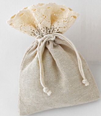 Πουγκί φτιαγμένο από λινάτσα ντυμένη με δαντέλα. Κομψή και πρωτότυπη μπομπονιέρα για ιδιαίτερες βαπτίσεις και εντυπωσιακούς vintage γάμους.