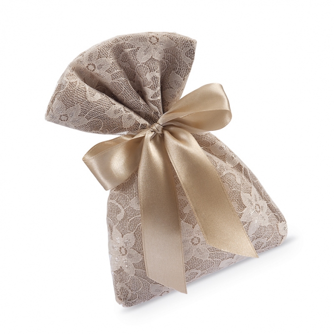 Πουγκί λινό natural με δαντέλα καφέ Ελάχιστος χρόνος παράδοσης: 8-10 εργάσιμες ημέρες. Ελάχιστη ποσότητα: 40τμχ./κωδικό Στην τιμή δεν περιλαμβάνεται ο στολισμός / δέσιμο.