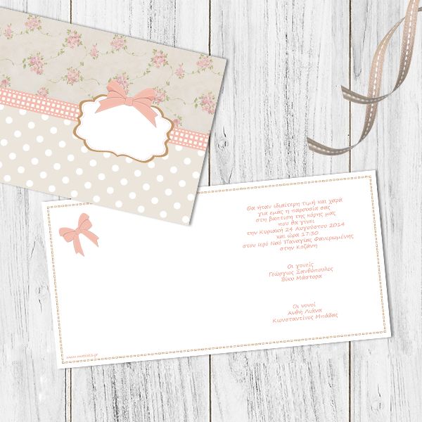 Προσκλητήριο Βάπτισης “Floral” Πουά με Λουλούδια και Φιόγκο Με Εκτύπωση
