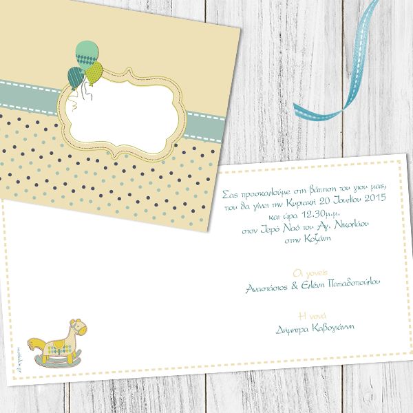 Προσκλητήριο Βάπτισης Πουά Μπαλόνια-Αλογάκι Με Εκτύπωση