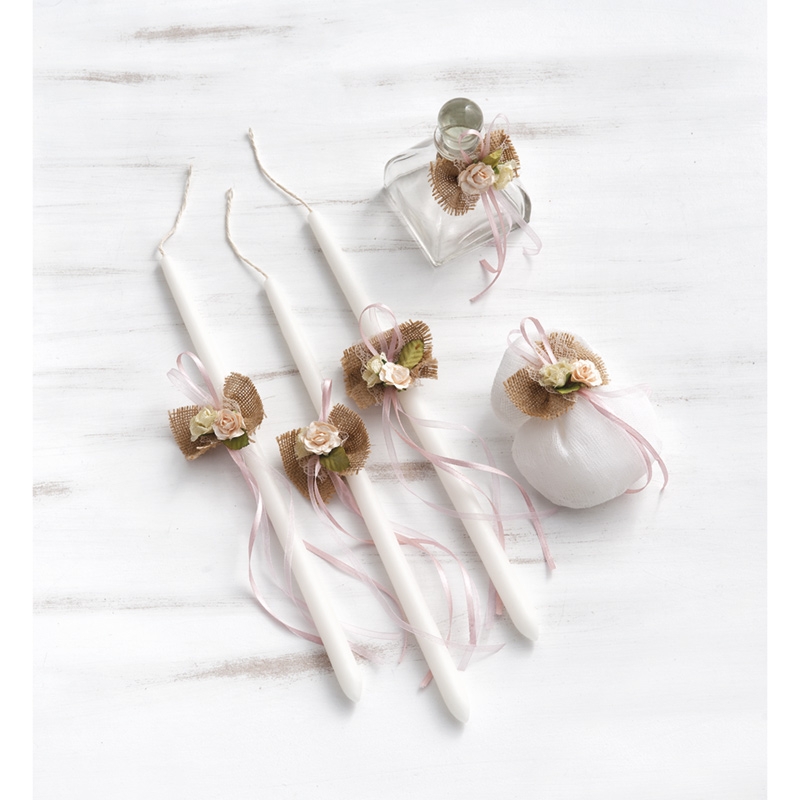 Σετ λαδιού σε φυσικές-ροζ αποχρώσεις, στολισμένα με λινάτσα,λουλουδάκια και με κορδέλες σατέν ροζ.Ο κωδικός περιλαμβάνει το μπουκάλι του λαδιού,το σαπούνι μέσα σε πουγκάκι και τα 3 κεράκια,όλα στολισμένα σε φυσικές-ροζ αποχρώσεις