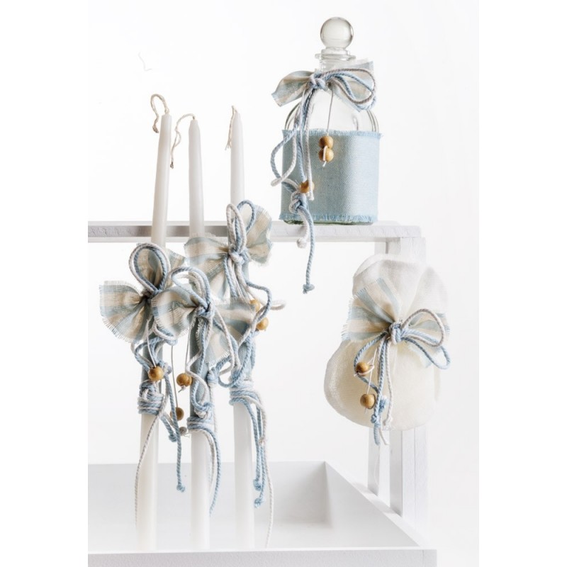 Σετ λαδιού σε σιέλ αποχρώσεις, στολισμένα με κορδόνια σιέλ-λευκά και ξύλινες φυσικές χάντρες .Ο κωδικός περιλαμβάνει το μπουκάλι του λαδιού,το σαπούνι μέσα σε πουγκάκι και τα 3 κεράκια,όλα στολισμένα σε σιέλ-λευκές αποχρώσεις