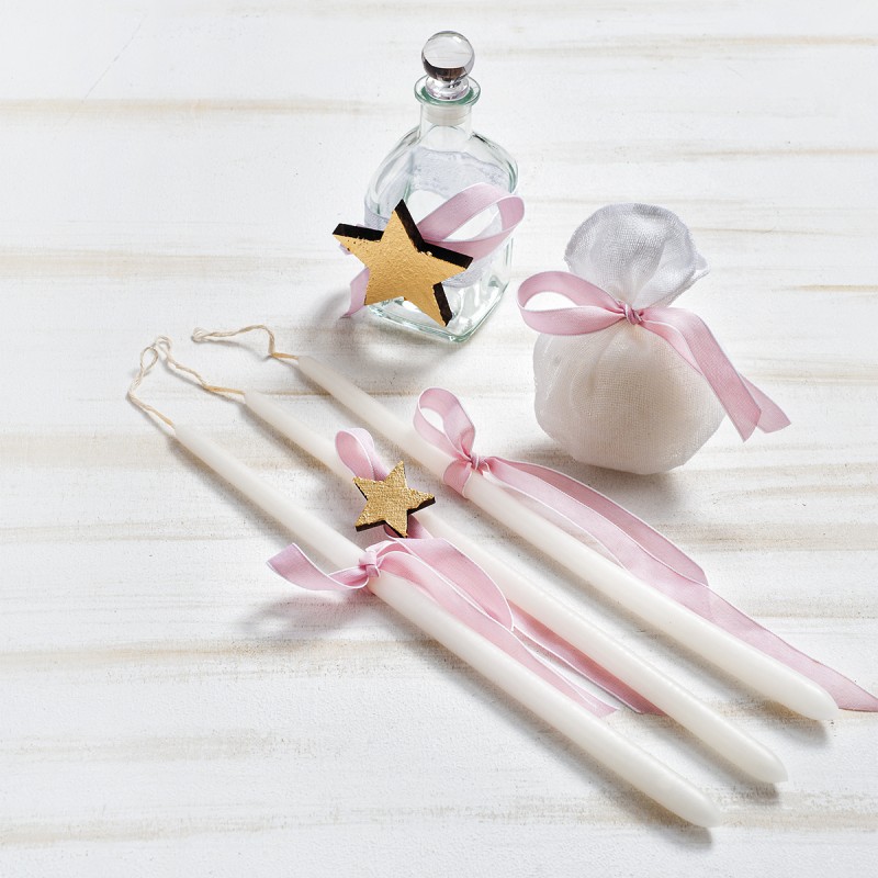 Σετ λαδιού στολισμένο με χρυσά αστέρια. Ο κωδικός περιλαμβάνει το μπουκάλι του λαδιού, το σαπούνι μέσα σε πουγκάκι και τα 3 κεράκια.