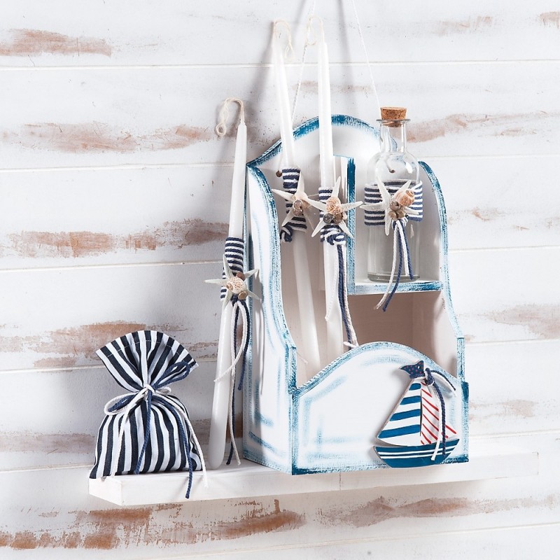 Ξύλινη λευκή κρεμαστή συσκευασία, ζωγραφισμένη στο χέρι με σβησίματα μπλε και διακοσμημένη με διάφορα ναυτικά στοιχεία όπως καράβι,αστερίες και κοχύλια. Η συσκευασία περιλαμβάνει 3 κεριά, σαπούνι μέσα σε πουγκάκι και μπουκάλι λαδιού, όλα στολισμένα σε ναυτικό στυλ.