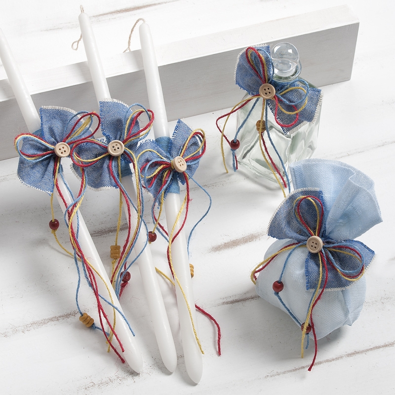 Σετ λαδιού σε σιέλ αποχρώσεις, στολισμένα με κορδόνια κίτρινα-κόκκινα-σιέλ και σιέλ φιογκάκια.Ο κωδικός περιλαμβάνει το μπουκάλι του λαδιού,το σαπούνι μέσα σε πουγκάκι και τα 3 κεράκια,όλα στολισμένα σε σιέλ αποχρώσεις με πολύχρωμα κορδόνια
