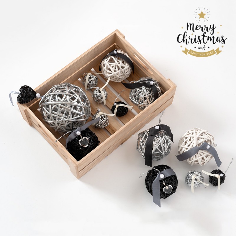 Σετ με χριστουγεννιάτικες μπάλες σε natural καφάσι. Περιλαμβάνει 13 μπάλες από μπαμπού (1 μεγάλη, 6 μεσαίες, 6 μικρές) σε μαύρο, ασημί και λευκό χρώμα. Είναι διακοσμημένες με πέρλες, καρδιές και κορδέλες.