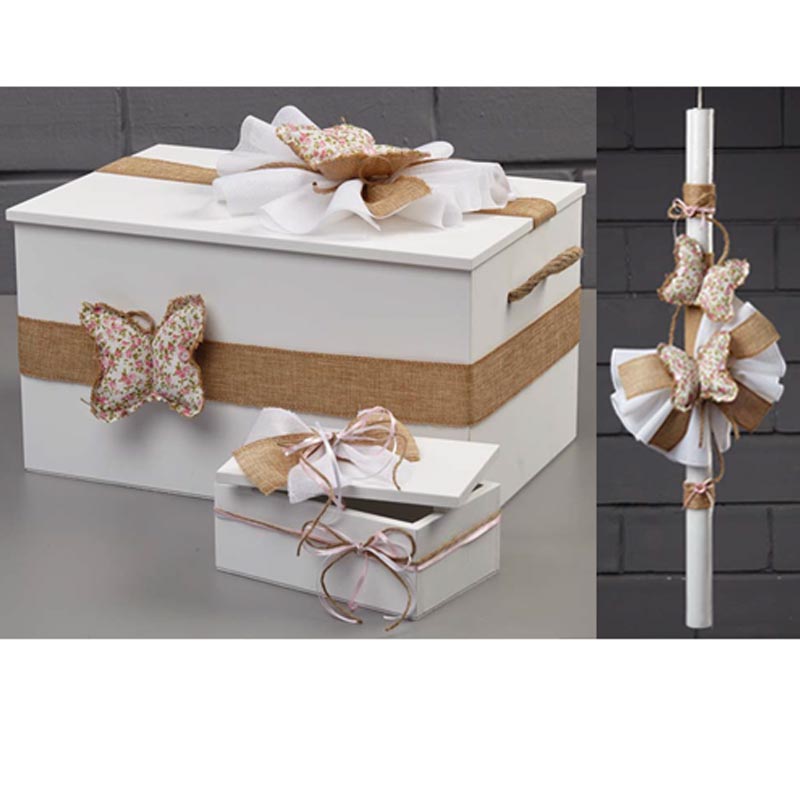 Το σετ περιλαμβάνει ένα μεγάλο στολισμένο κουτι, ένα μικρό, και τη λαμπάδα.