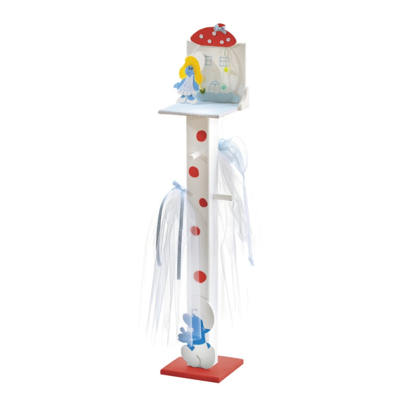 Ξύλινος λευκός κηροστάτης-κρεμάστρα,ζωγραφισμένος στο χέρι σε κόκκινες-σιέλ αποχρώσεις.Η πλάτη του κηροστάτη διακοσμείται με ξύλινο στρουμφόσπιτο μπροστά από το οποίο στέκεται ξύλινη φιγούρα της στρουμφίτας και το μπροστινό τμήμα του κηροστάτη διακοσμεί ξύλινη φιγούρα από στρουμφάκι ενώ από τις κρεμαστρούλες κρεμιέται τούλι λευκό με κορδελίτσες σιέλ.Στην τιμή περιλαμβάνεται και το κερί για την εκκλησία.