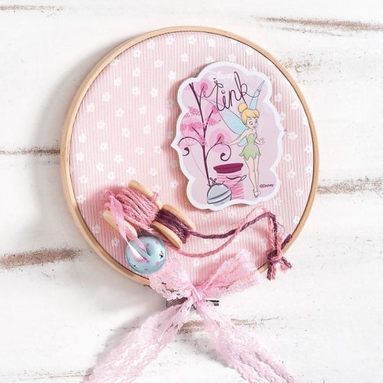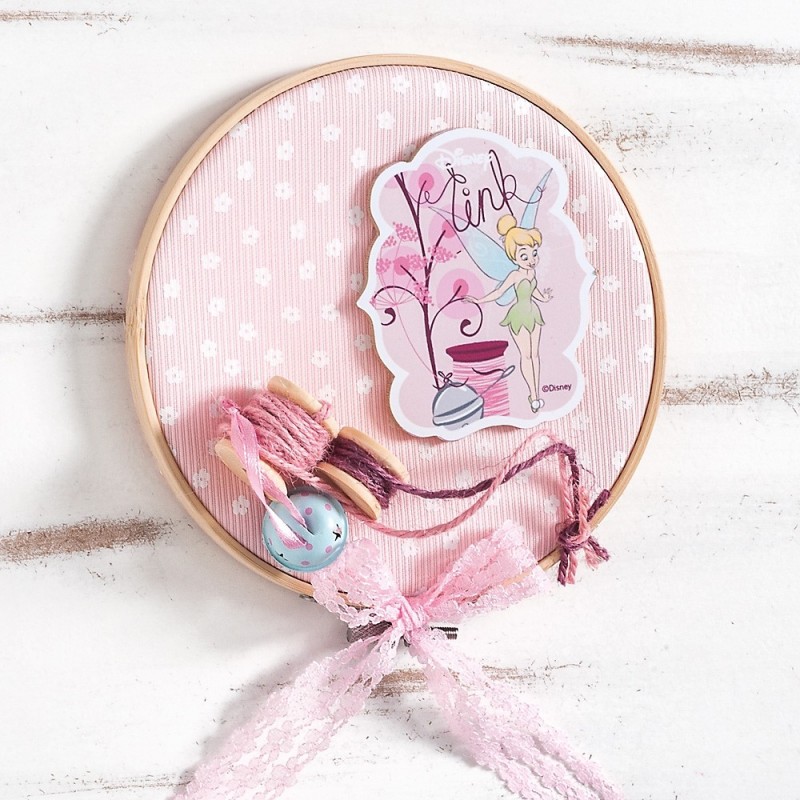 Disney διακοσμητικό χειροποίητο ντυμένο στρογγυλό τελάρο κεντήματος με διάμετρο 16cm. Είναι στολισμένο με ξύλινη παράσταση print Tinkerbell flowers, ύφασμα λευκά άνθη και κουβαρίστρες.