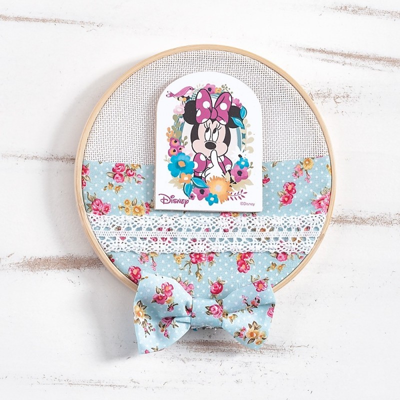 Disney διακοσμητικό χειροποίητο ντυμένο στρογγυλό τελάρο κεντήματος με διάμετρο 16cm. Είναι στολισμένο με ξύλινη παράσταση print Minnie Flowers και floral ύφασμα με λευκή δαντέλα.