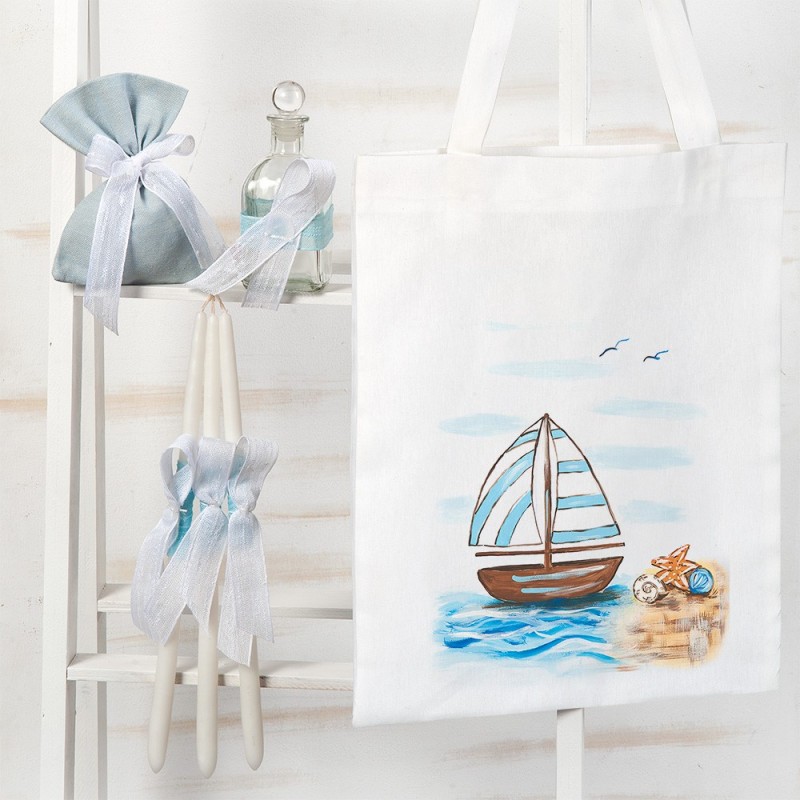 Ζωγραφιστή υφασμάτινη τσάντα με 3 κεριά,σαπούνι και μπουκάλι λαδιού στολισμένα σε σιέλ,λευκές αποχρώσεις. Η τσάντα είναι ζωγραφιστή στο μπροστινό κομμάτι με θέμα καραβάκι στον γιαλό.