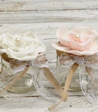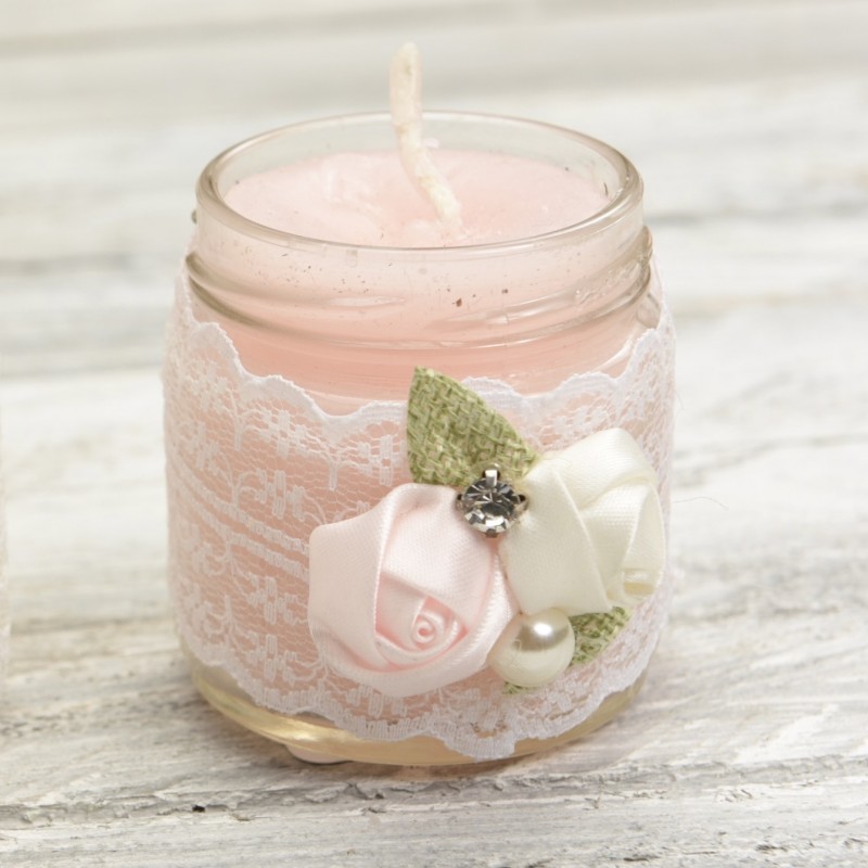 Βαζάκι κερί στολισμένο στρογγυλό με δαντέλα και σατέν τριαντάφυλλα