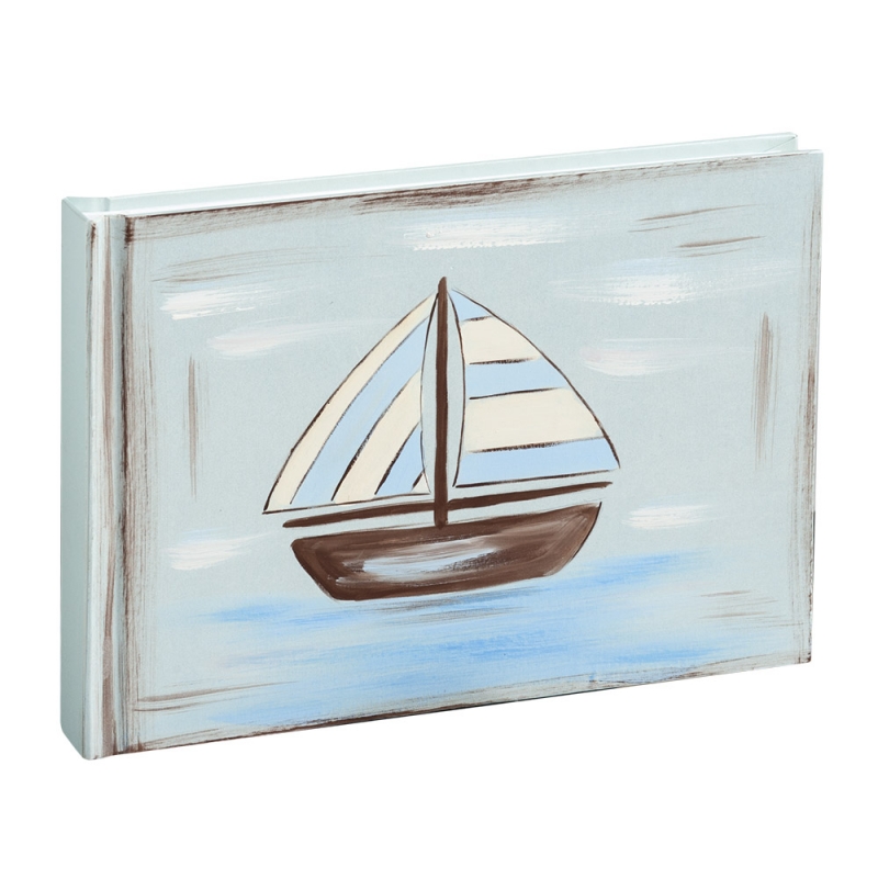 Βιβλίο ευχών λευκό εξωτερικά από χοντρό χαρτόνι,ζωγραφισμένο στο χέρι σε ναυτικό στυλ με καράβι σιέλ-καφέ πάνω σε φόντο σιέλ με σβησίματα λευκά-καφέ
