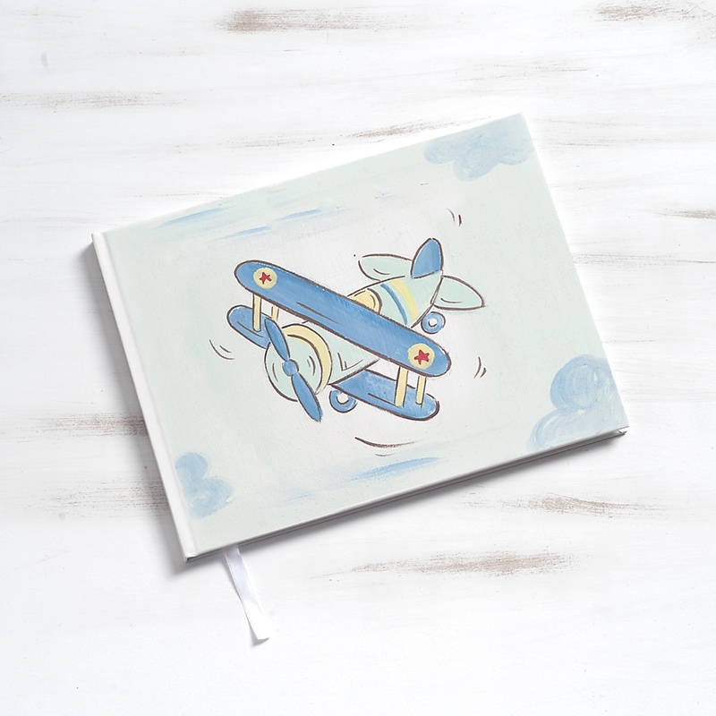 Βιβλίο ευχών λευκό εξωτερικά από χοντρό χαρτόνι,ζωγραφισμένο στο χέρι με αεροπλάνο σε χρώμα βεραμάν-σιέλ να φαίνεται πως πετάει φηλά στον ουρανό ανάμεσα στα σύννεφα