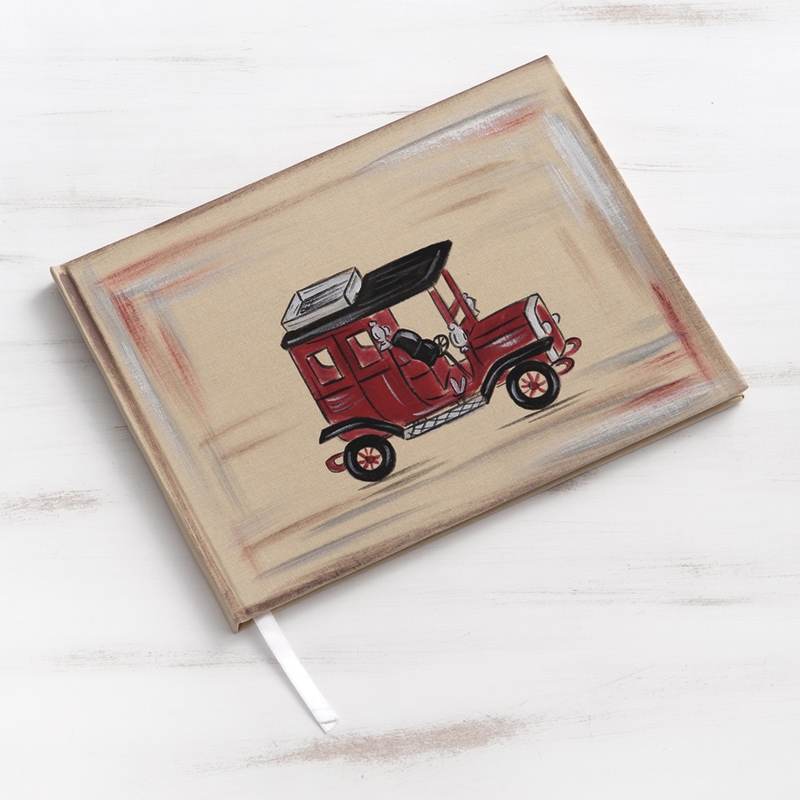 Βιβλίο ευχών λευκό εξωτερικά από χοντρό χαρτόνι,ζωγραφισμένο στο χέρι με αυτοκίνητο αντίκα κόκκινο και σβησίματα καφέ-γκρι-κόκκινα πάνω σε φόντο μπεζ