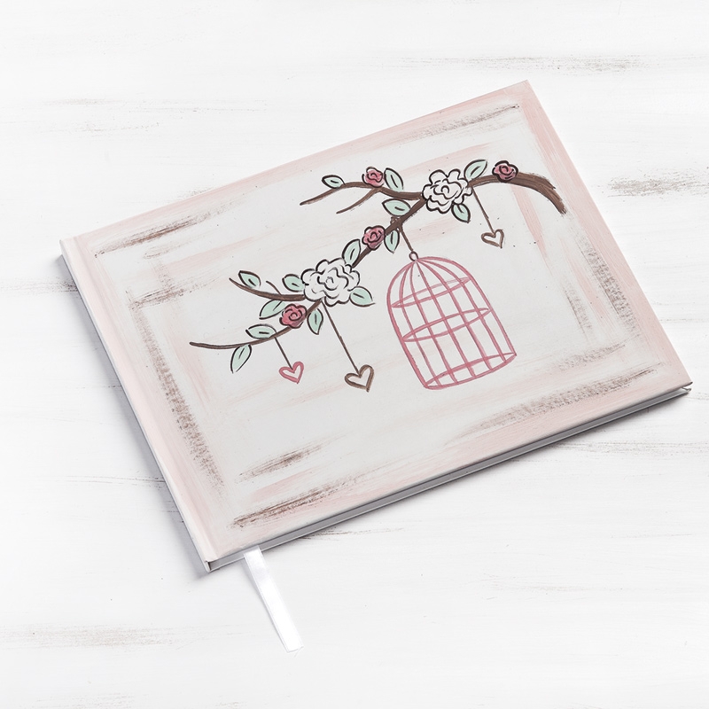 Βιβλίο ευχών λευκό εξωτερικά από χοντρό χαρτόνι και ζωγραφισμένο στο χέρι με κλουβάκι να κρέμεται από κλαδί δέντρου πάνω σε φόντο με σβησίματα καφέ-ροζ