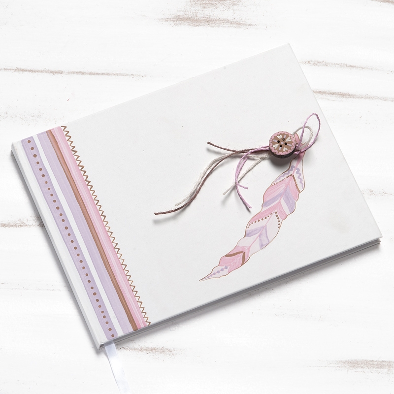 Βιβλίο ευχών λευκό εξωτερικά από χοντρό χαρτόνι,ζωγραφισμένο στο χέρι με ethnic μοτίβο και φτερό σε αποχρώσεις ροζ-λιλά-καφέ