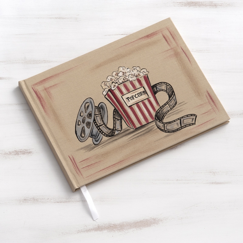 Βιβλίο ευχών λευκό εξωτερικά από χοντρό χαρτόνι,ζωγραφισμένο στο χέρι με θέμα σινεμά με ταινία και pop corn και σβησίματα καφέ-γκρι-κόκκινα πάνω σε φόντο μπεζ