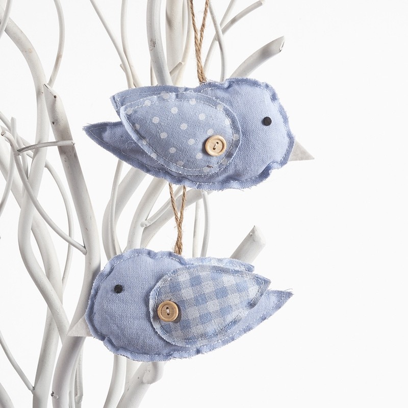 Υφασμάτινο διακοσμητικό κρεμαστό πουλί σε σιέλ χρώμα. Ο κωδικός περιλαμβάνει 2 αποχρώσεις στα φτερά (καρό, πουά) και κουμπάκι