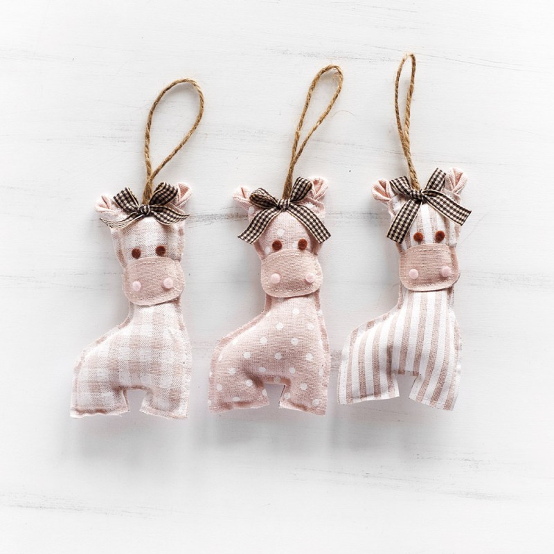 Υφασμάτινη διακοσμητική κρεμαστή καμηλοπάρδαλη σε ροζ χρώμα με φιογκάκι στο κεφάλι.